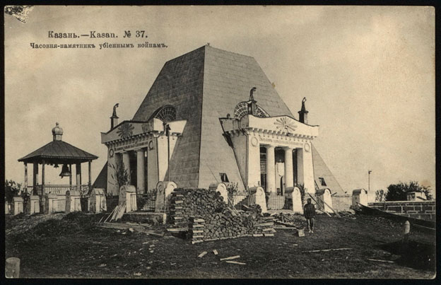 Автором проекта был известный петербургский архитектор Н.Ф. Алферов. Ему Казань обязана появлением столь исключительного сооружения, не имеющего близких аналогов ни в нашем городе, ни вообще среди православных храмов России. Разумеется, внутреннее размещение основного объема, алтаря, иконостаса и других частей было строго каноничным, но вот внешний пирамидальный облик храма поражал и поражает своей неординарностью, которая ставит его в разряд совершенно уникальных в православном мире. Впрочем, сама исключительность места требовала и исключительности внешнего выражения (едва ли не крупнейшая во всей России братская могила павших в бою за неё витязей). Одно в России Куликово поле, одно Бородино, одно Чудское озеро и одна Казань.